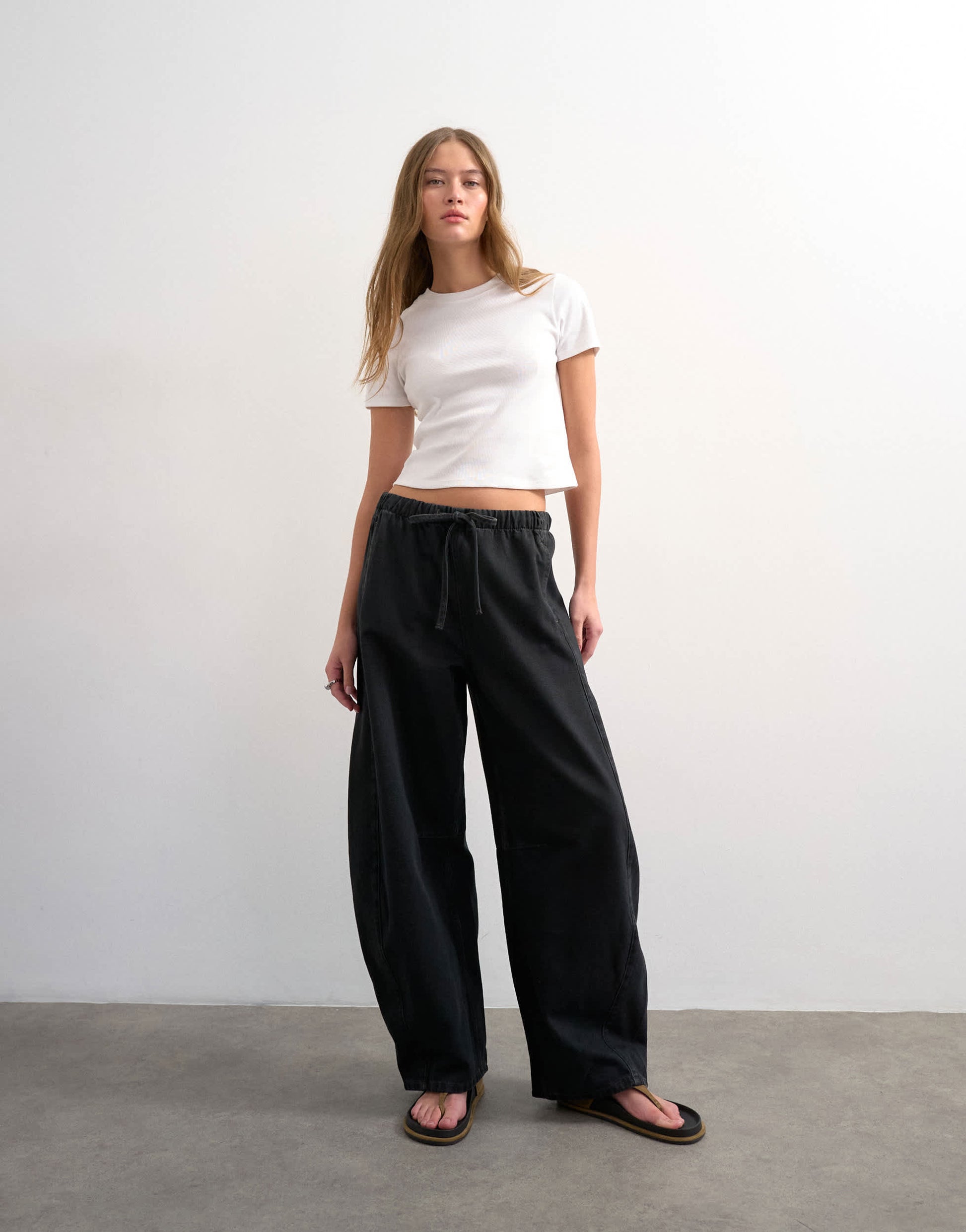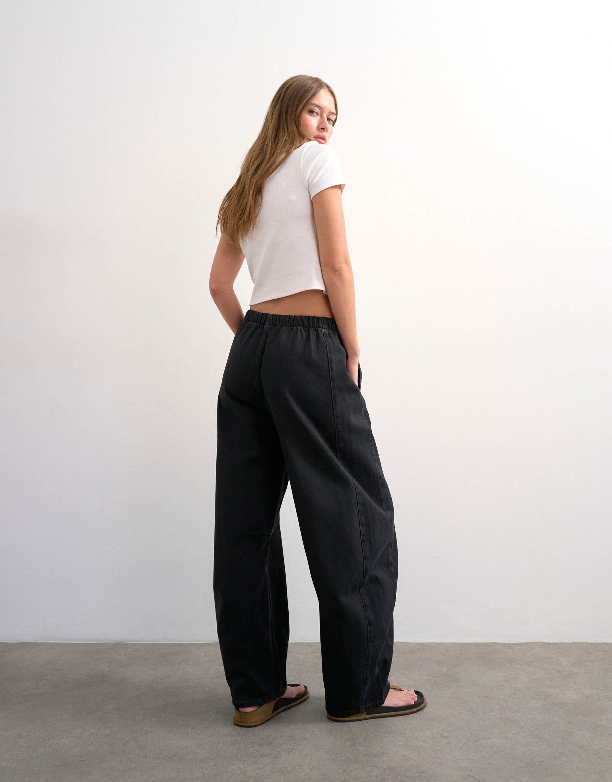 The Pull-On Barrel jeans are cut with a mid-rise, elasticated waist and a barrel leg that stacks at the ankle. Featuring two side pockets and an adjustable waist, this style is crafted from lightweight denim in a worn-in black wash.