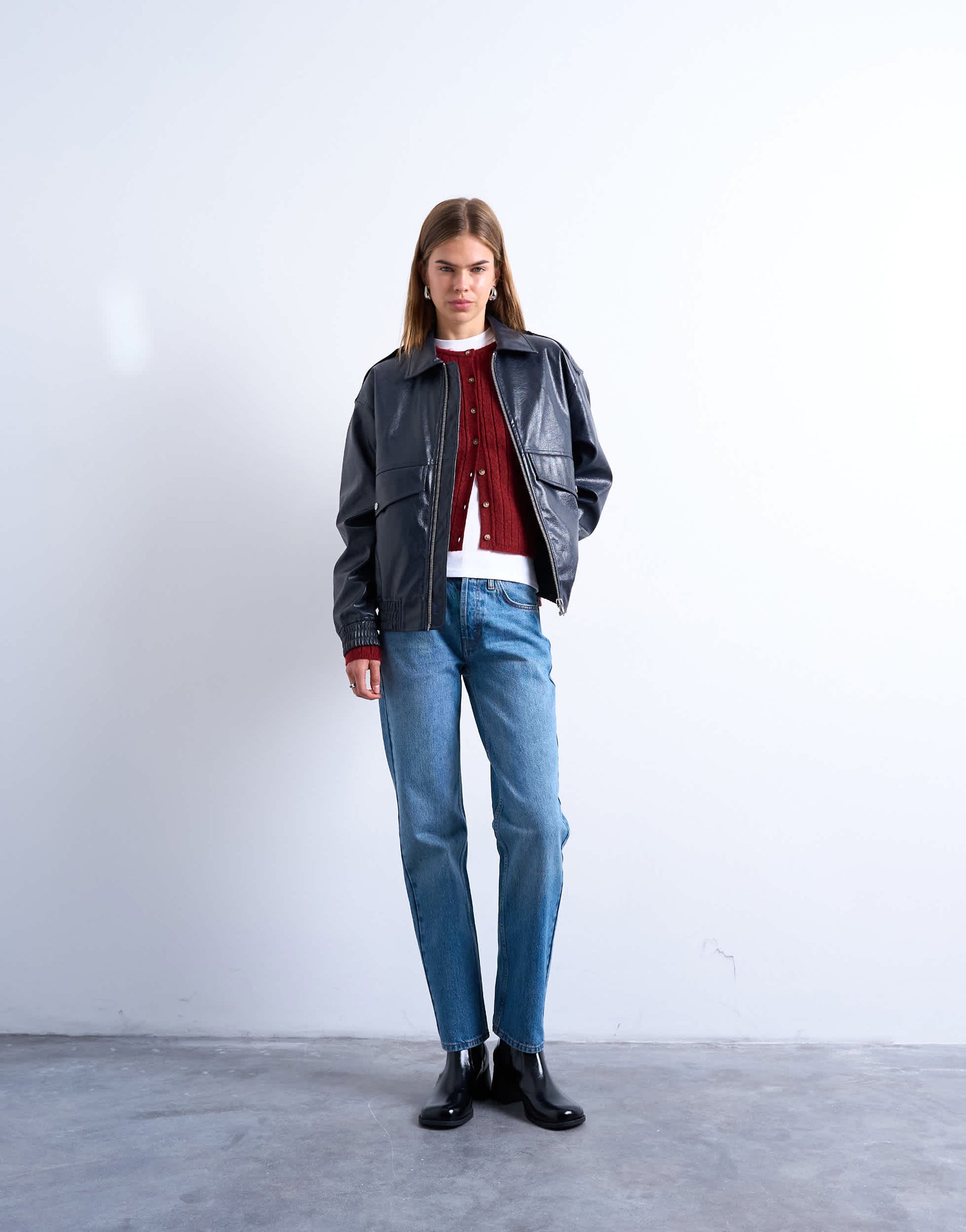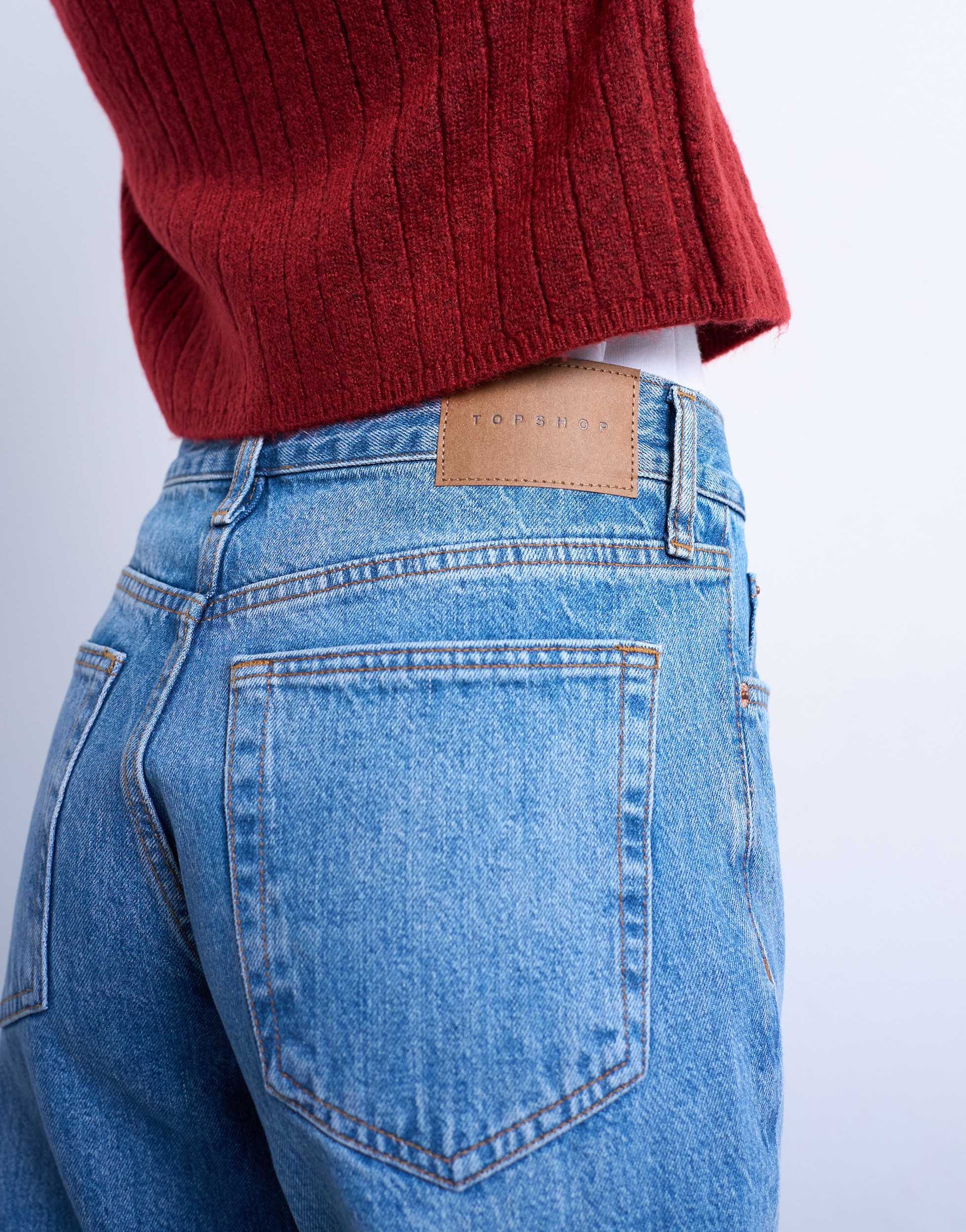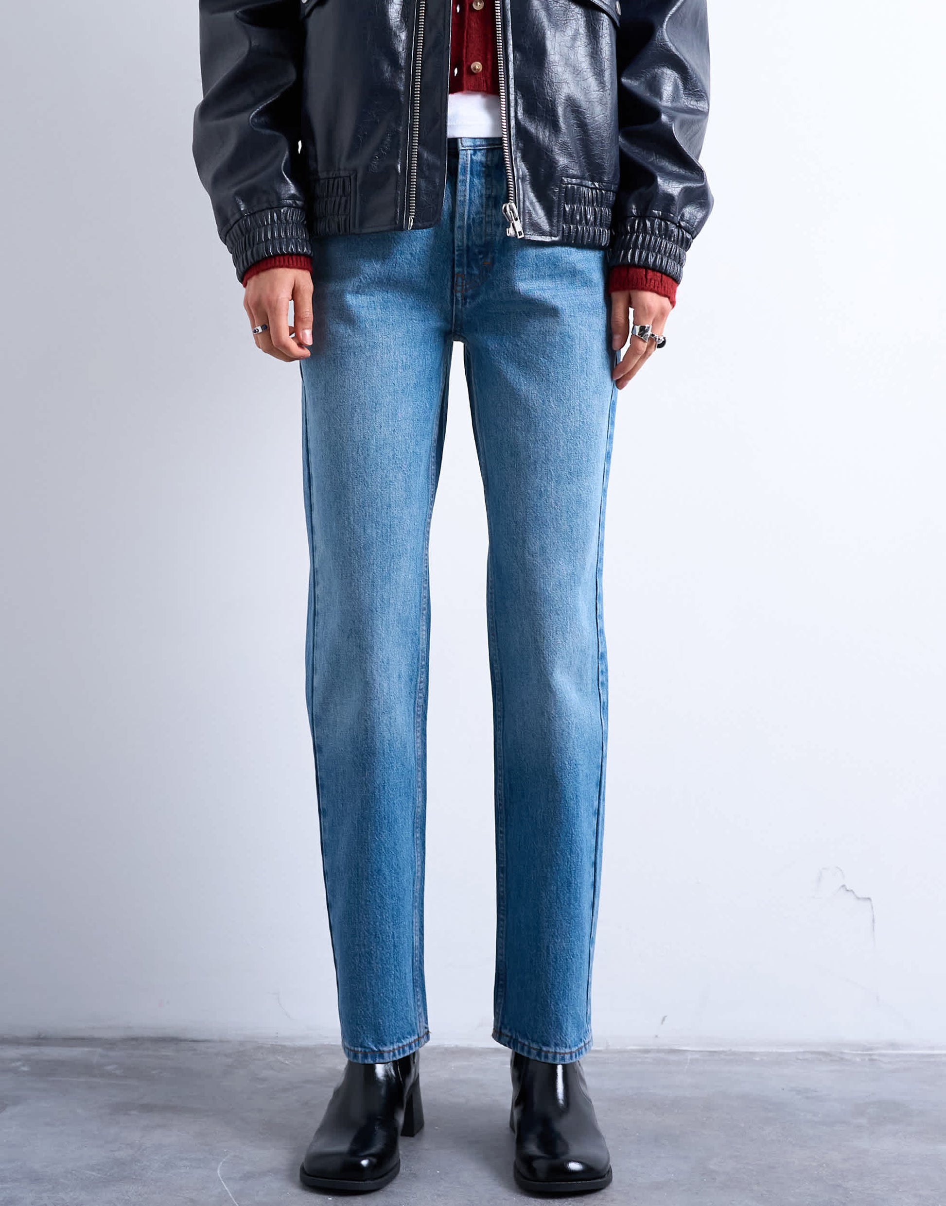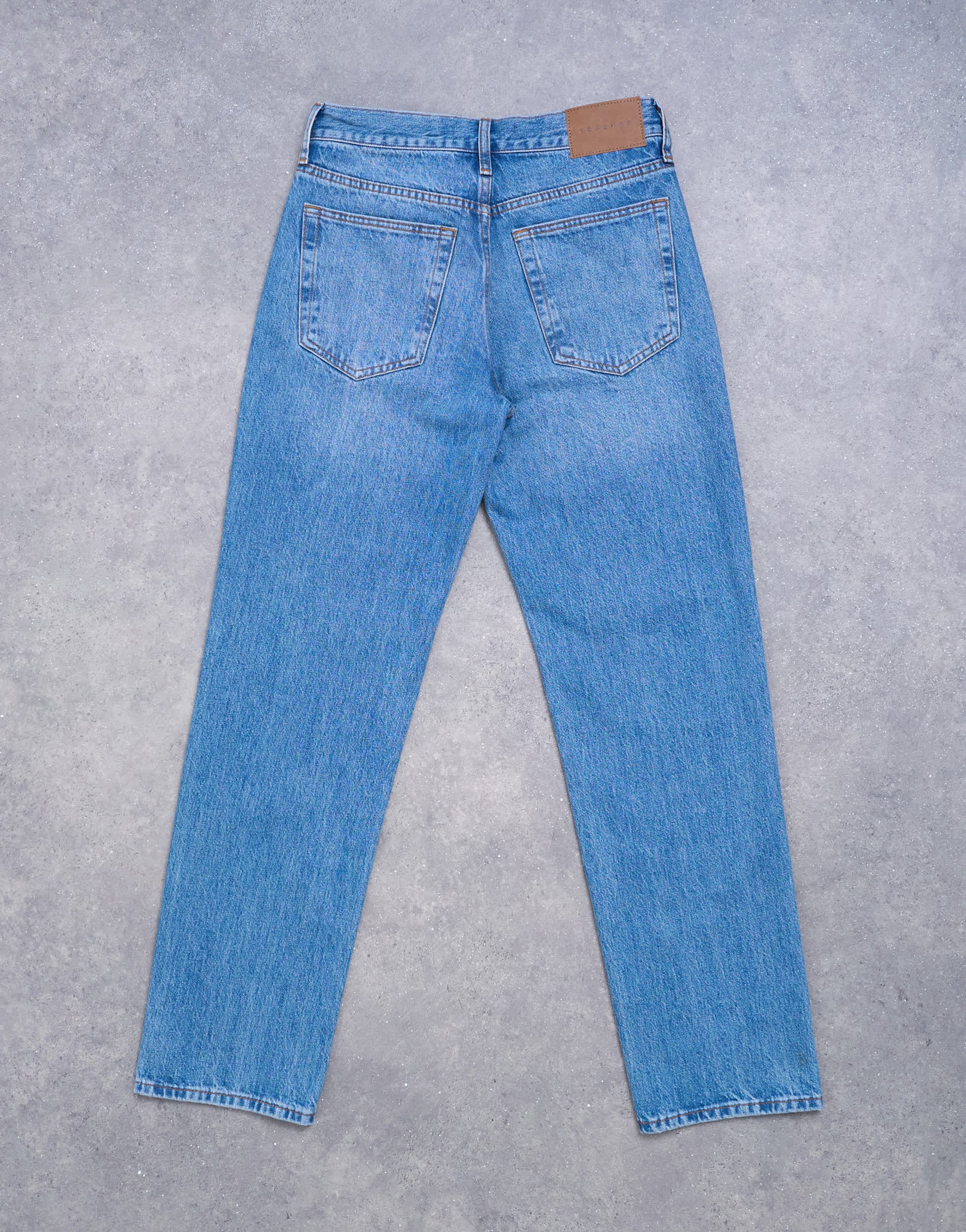 Jeans by TopshopThese Runway jeans are cut with a mid-rise waist and a straight leg. Featuring belt loops, five functional pockets and a branded patch to the reverse, this style has a classic stacked hem and is crafted from non-stretch, mid-weight denim in a mid-blue wash.