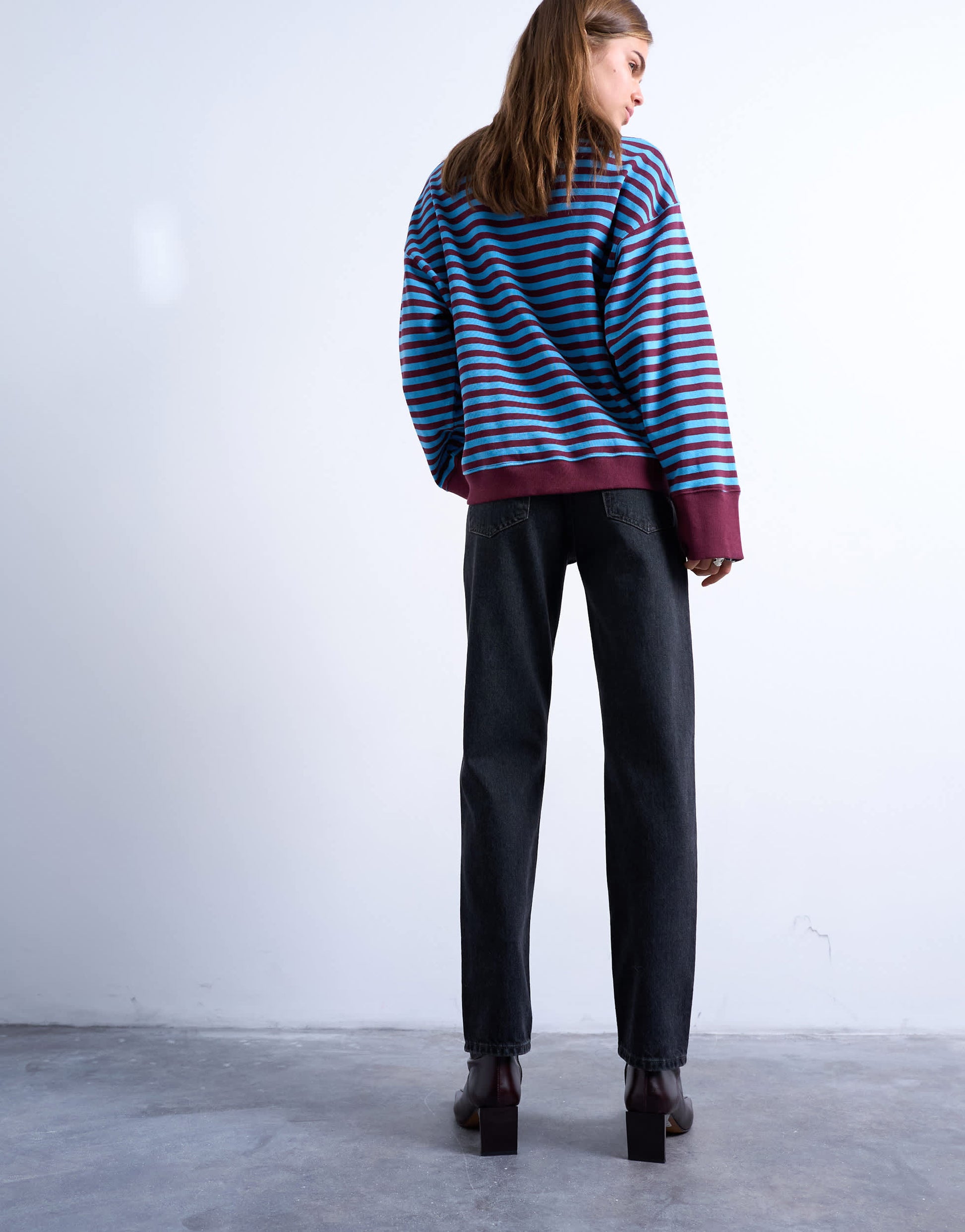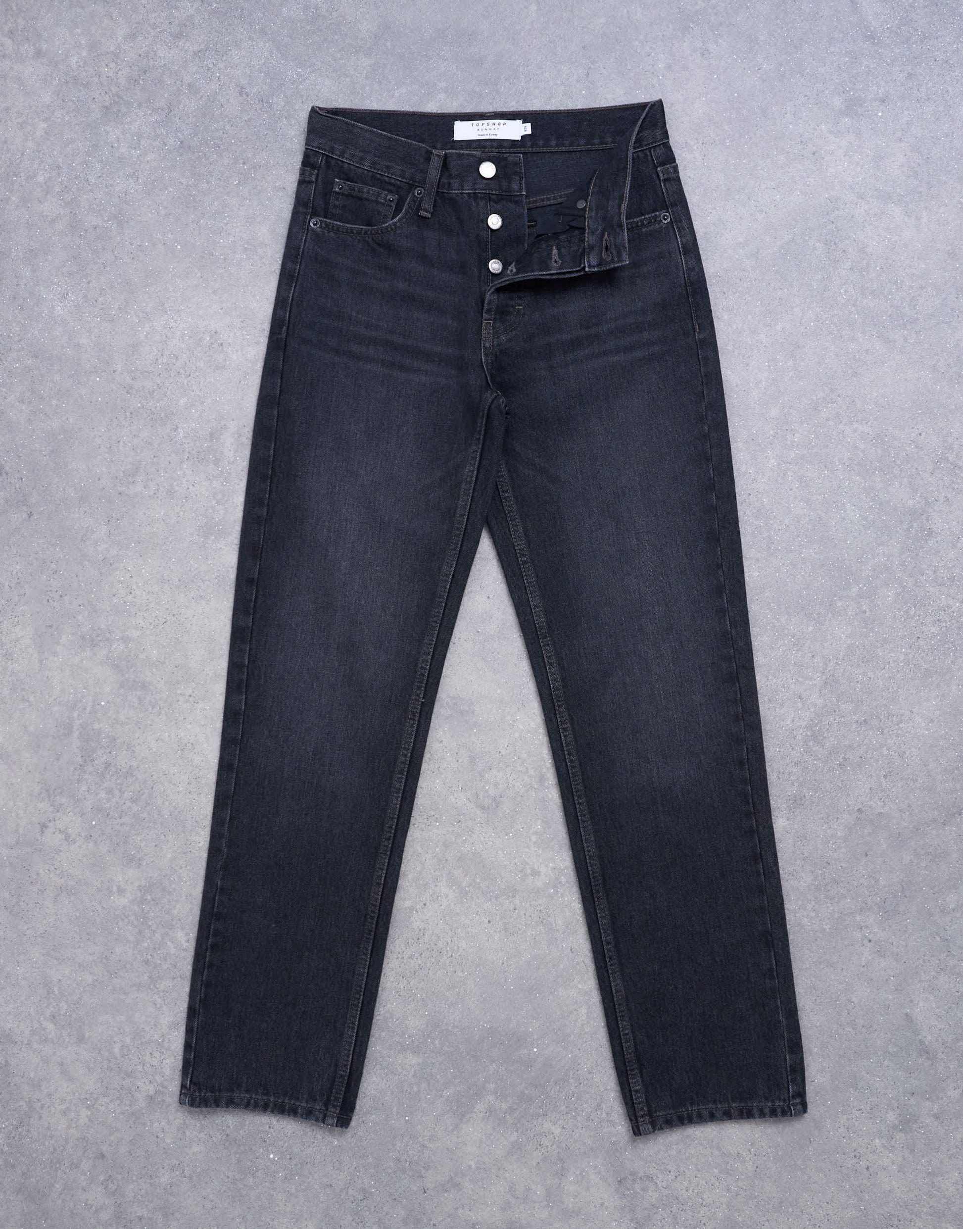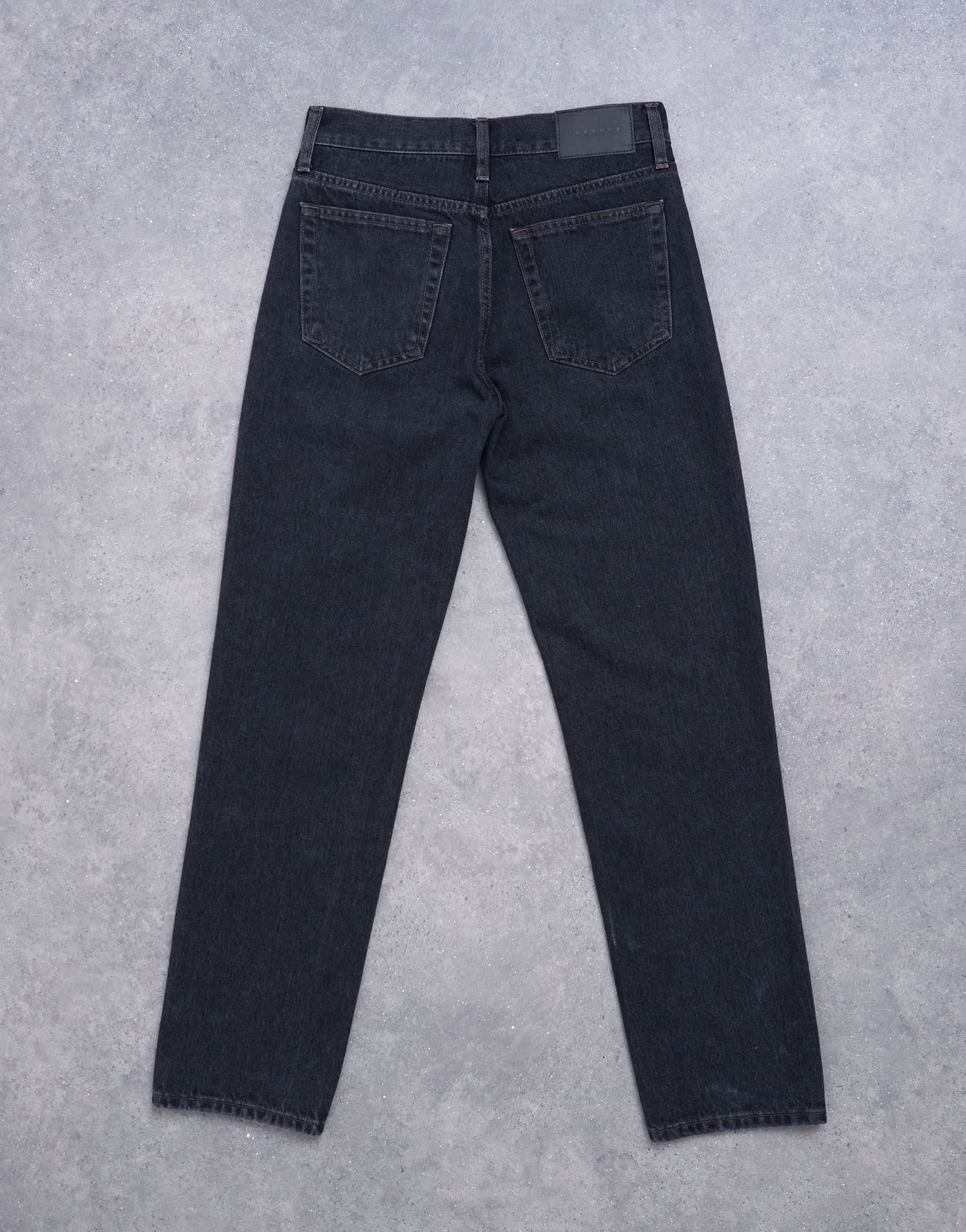 Jeans by TopshopThese Runway jeans are cut with a mid-rise waist and a straight leg. Featuring belt loops, five functional pockets and a branded patch to the reverse, this style has a classic stacked hem and is crafted from non-stretch, mid-weight denim in a worn-in black wash.