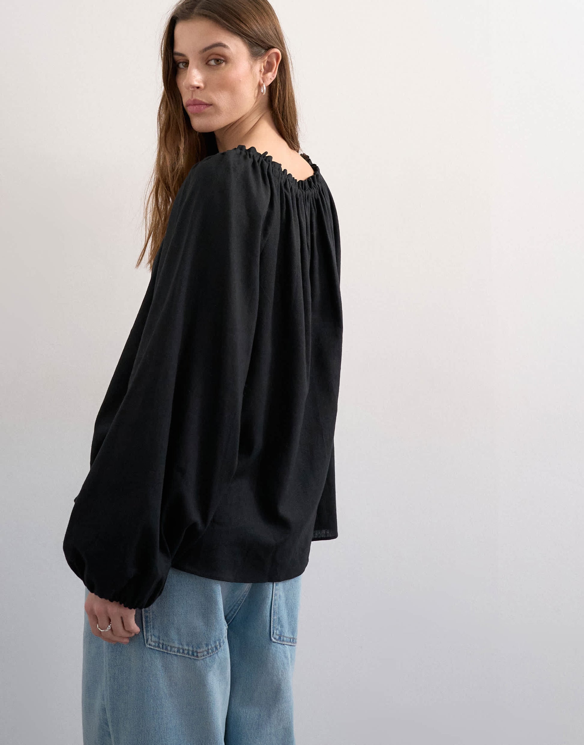 Tops by TopshopThis blouse is crafted from lightweight woven fabric in a black shade. It features a scoop neck, blouson sleeves, a tie front and ruffle detailing on a relaxed fit.